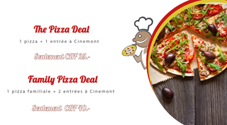 • Pizza-Kino: 1 Kinoticket + eine Pizza CHF  25.-  oder 2 Kinotickets + eine Familien Pizza CHF 40.-  Angebot gültig Dienstags bis Donnerstags